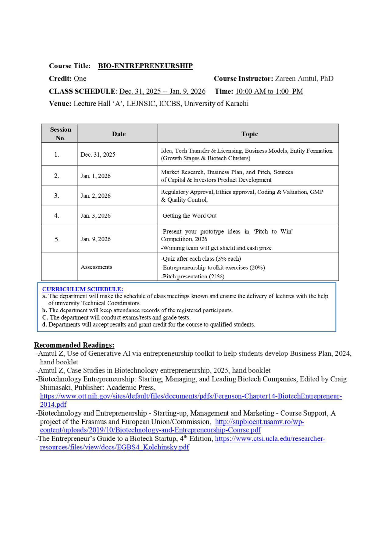 Sciences (ICCBS) is organizing a one credit hour course entitled, “Biotechnology